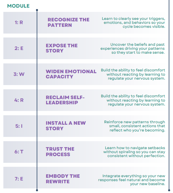 Through a series of structured modules, guided exercises, and real-life integration tools, you’ll learn how to pause instead of react, support yourself instead of criticize, and create lasting change from the inside out.